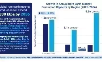 A produção global de ímãs de terras raras deve ultrapassar 330 ktpa até 2036, impulsionada pela relocalização estratégica para EUA e Europa em resposta a restrições de fornecimento e ameaças tarifárias.