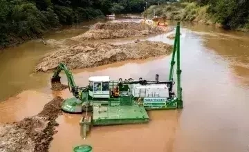A Vale Verde utiliza a inovadora draga anfíbia Watermaster Classe V para desassorear o Rio Paraopeba, em Brumadinho, acelerando a recuperação do ecossistema após o rompimento da barragem em 2019.